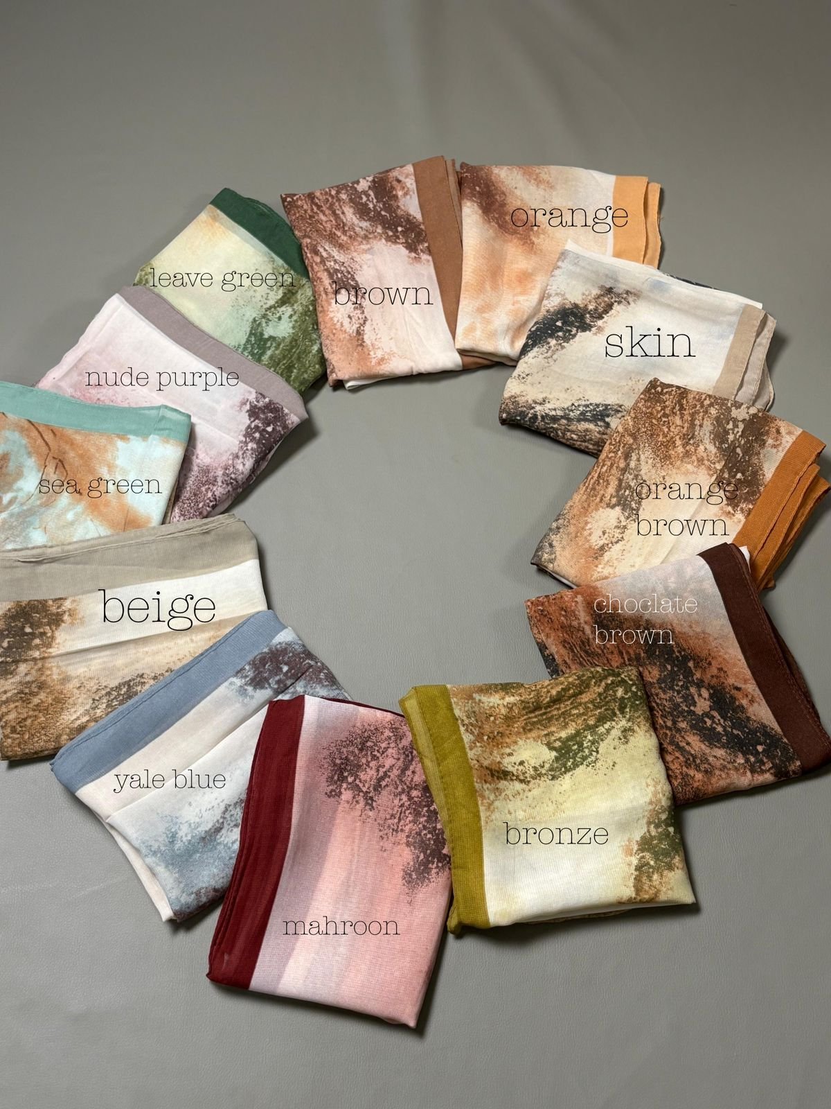 Beige, Brown, bronze, choclate brown, leave green, Mehroon, nude purple, Orange, orange brown, Sea Green, skin, yale blue |